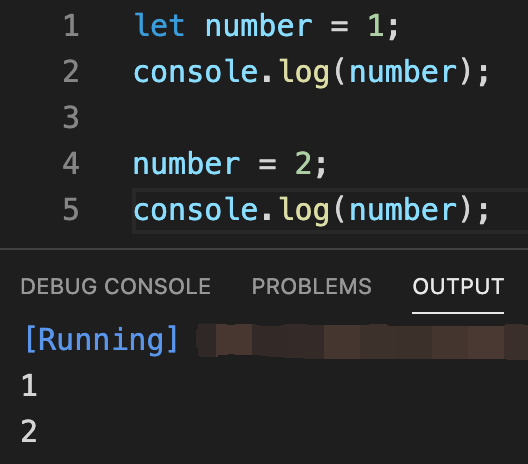 최초에 number 변수를 선언할 때 값 1을 할당하여 선언해주고 나서 console.log()로 출력한 뒤 다시 number 변수에 값 2를 재할당해 주고 console.log()로 number 변수 값을 출력해주는 코드입니다.
