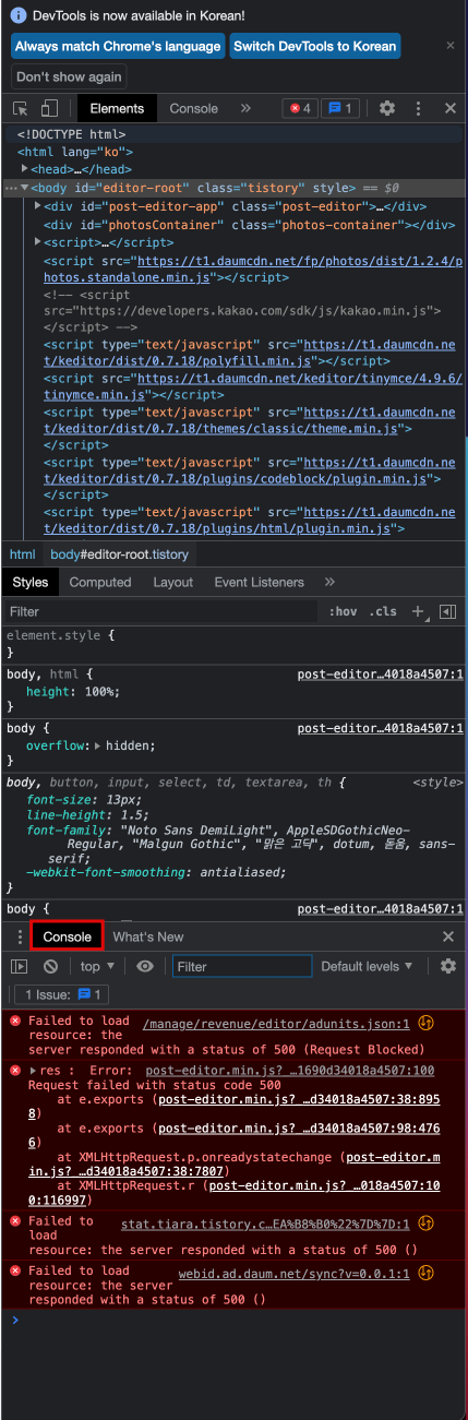 이런 개발자 도구가 나타나는데 아래쪽에 'Console'에서 실행시켜볼 수 있습니다.