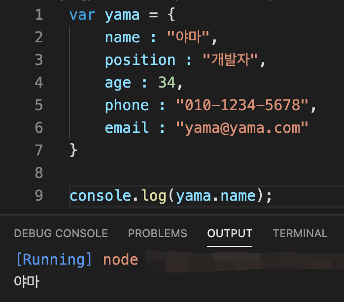 위의 yama객체의 속성은 'name', ' position', 'age', 'phone', 'email'이고, 속성 값은 "야마", "개발자", 34, "010-1234-5678", "yama@yama.com"이 되는 거죠.