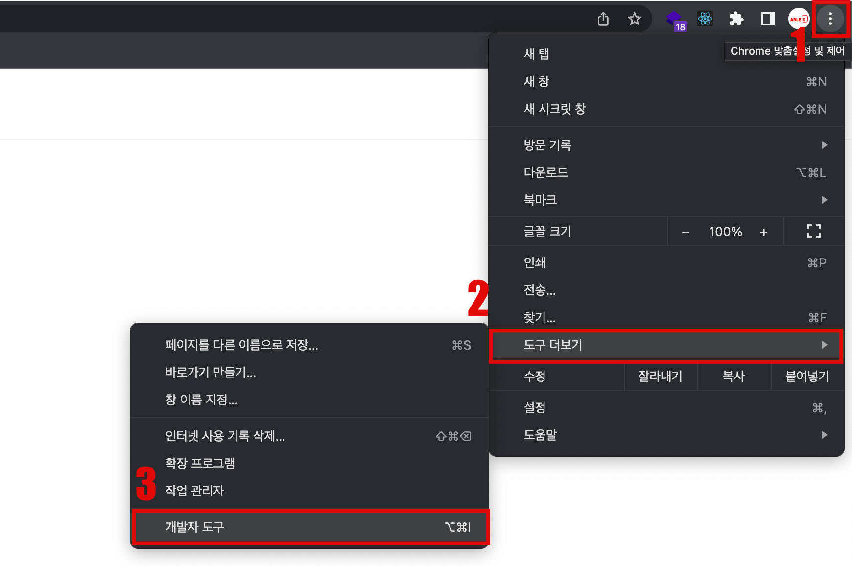 그걸 누르시고 도구 더 보기 -> 개발자 도구를 클릭해 개발자 도구를 열어주세요!