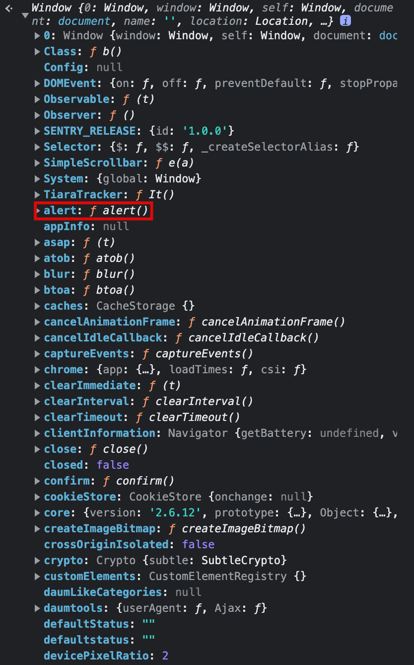 Window 객체 안에 들어 있는 요소가 모두 표시되는데요 우리가 사용해 볼 alert도 보이네요!
