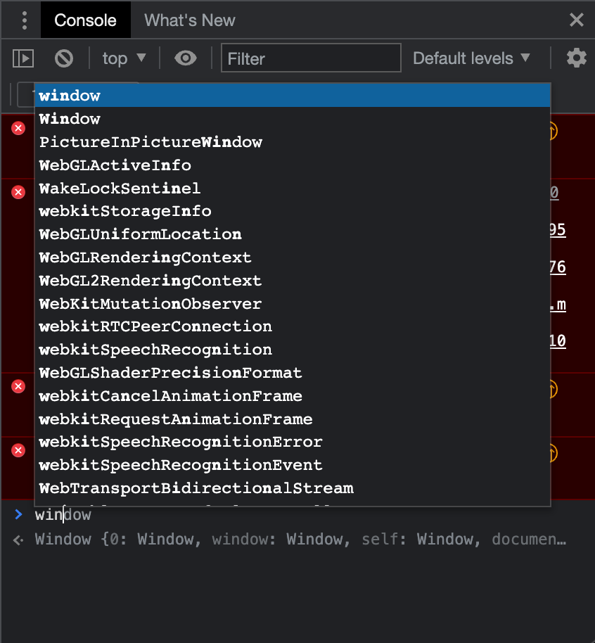 Console에 'win'까지만 입력해도 관련된 것들이 많이 나오는데요, 우리는 window를 입력해 보도록 하겠습니다.