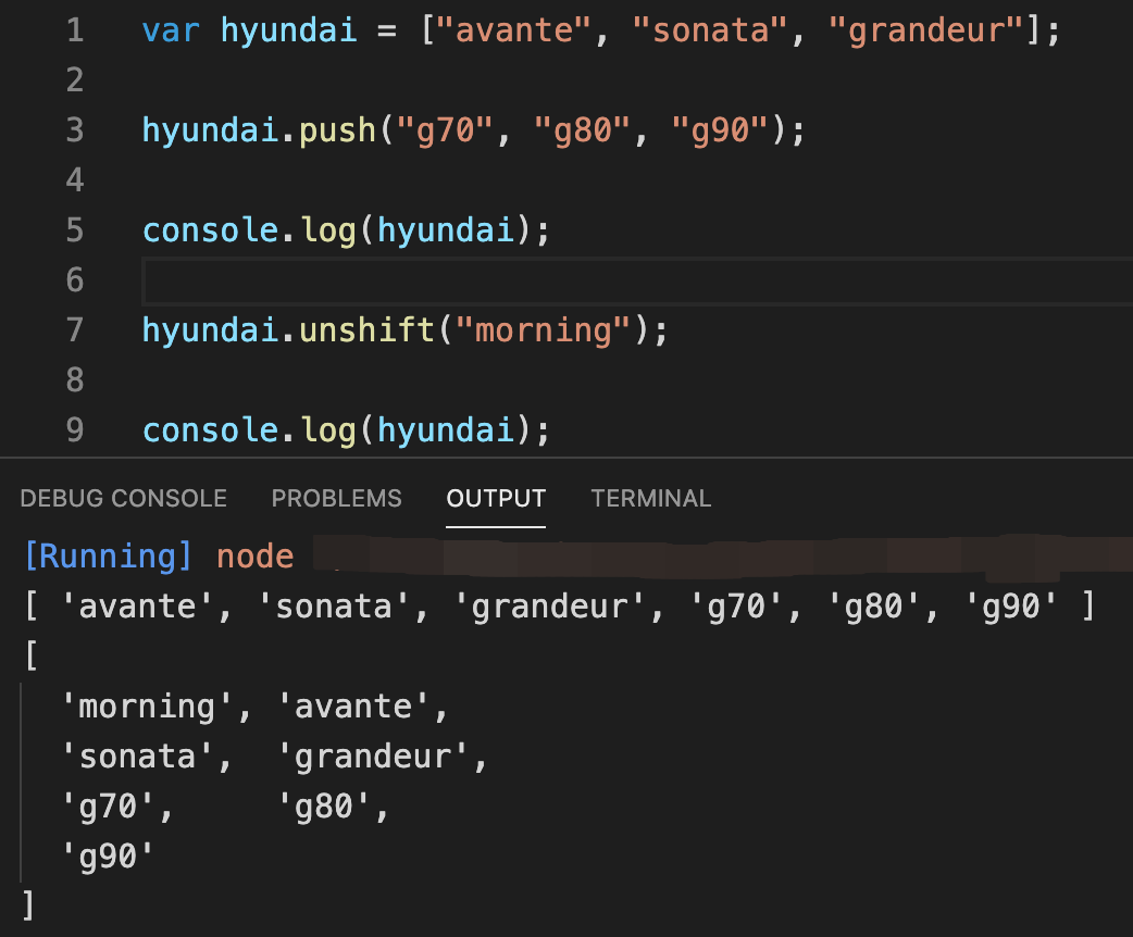 지난 시간에 만들었던 hyundai 배열을 사용하여 push와 unshift 함수를 사용하여 실습해 보도록 하겠습니다!
