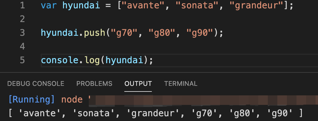 먼저 push 함수를 사용하여 기존의 hyundai 배열의 맨 끝에 g70, g80, g90을 추가해 보도록 하겠습니다!