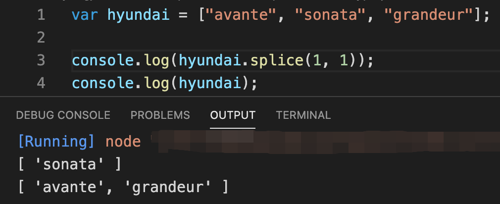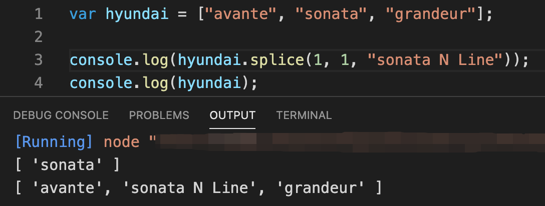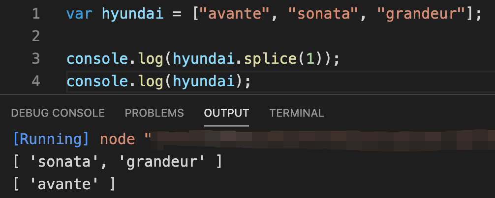 splice로 추출되어 삭제된 데이터는 "sonata"와 "grandeur"이라는 걸 확인할 수 있고, 두 데이터가 삭제되고 난 이후 hyundai 배열에는 "avante" 값만 남아있는걸 확인 할 수 있습니다!